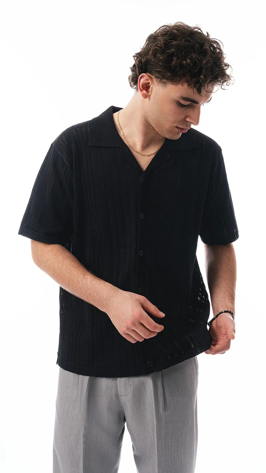 Camicia estiva da uomo a mezze maniche Colore: nero profondo Tessuto traforato testurizzato, leggero e traspirante Linea pulita, senza tasche Vestibilità regolare, stile casual-elegante Perfetta per l’estate, vacanze o serate informali